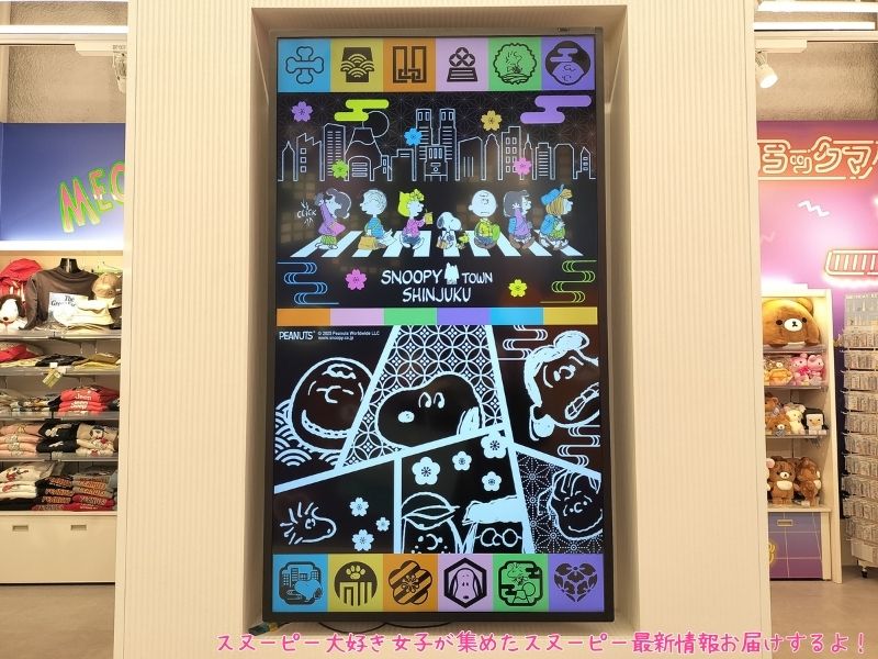 スヌーピータウンショップとリラックマストアの間には、スヌタウン新宿店が表示されたディスプレイがあったよー。