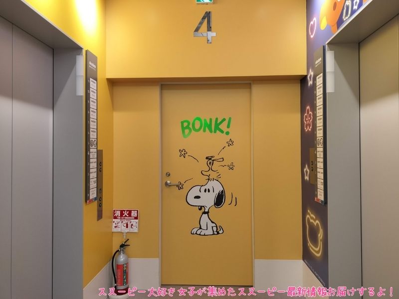 (エレベーターの右側がスヌーピー以外(リラックマ、すみっこぐらし、ミッフィー)のキャラクターショップになっているよ。)